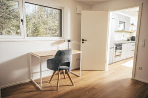 Ein zweites Schlafzimmer ist mit ausziehbarer Couch ausgestattet, die eine Liegefläche von 140 x 200cm bietet sowie mit einem Schreibtisch. Dieses Zimmer kann alternativ optimal als Arbeitszimmer genützt werden.